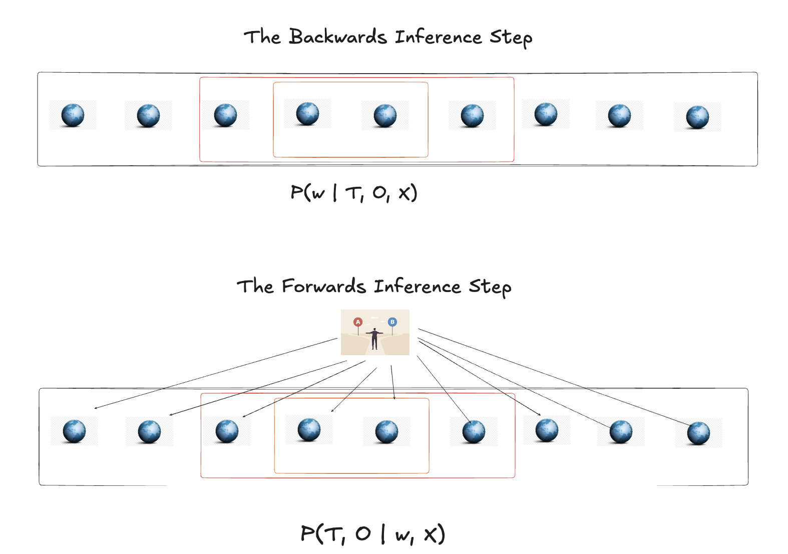 This is a two step move in the Bayesian paradigm. First we infer “backwards” what is the most plausible state of the world \(w\) conditioned on the observable data X, T, O. The “world” of the model is defined by: (1) a causal graph relating variables, (2) likelihood functions specifying how each variable depends on its causes, and (3) prior distributions over parameters. Optionally, this may include latent confounders, measurement models, and selection mechanisms—each adding structural detail but also complexity. With this world \(w = \{ \alpha, \beta_{1}, \beta_{2} ... \}\) in place, we continue to assess the probabilistic predictive distribution of treatment and outcome at the plausible range of counterfactual worlds.